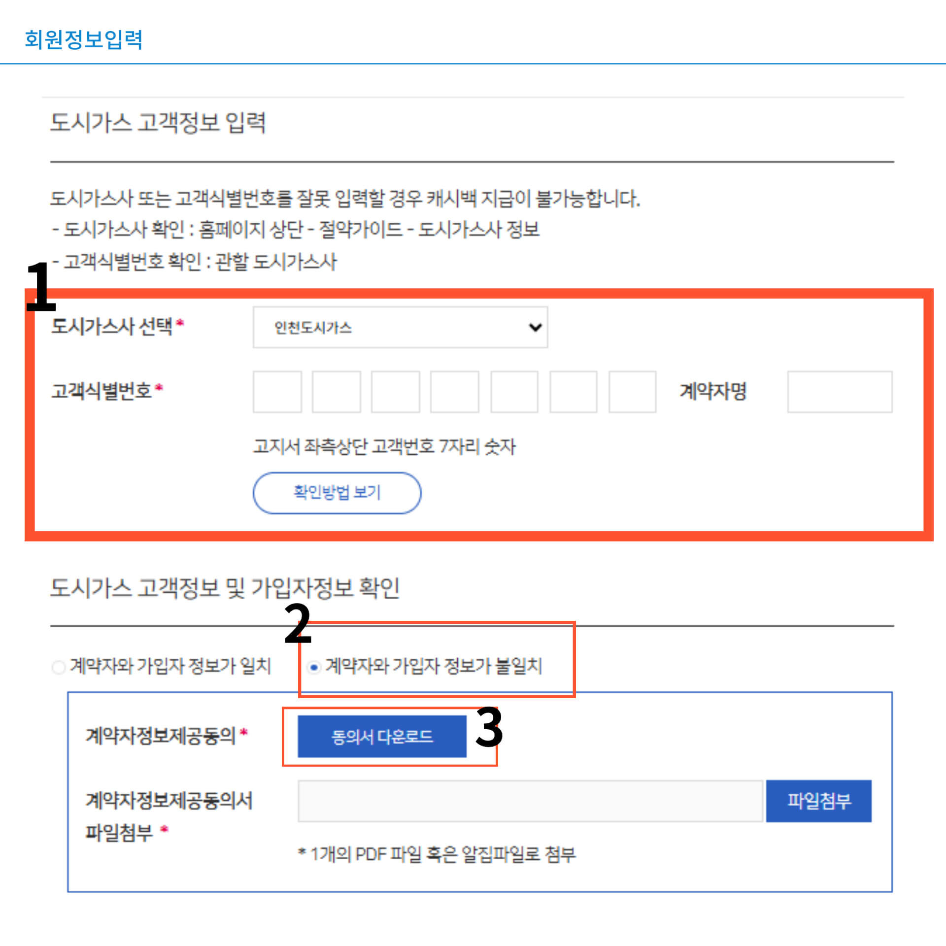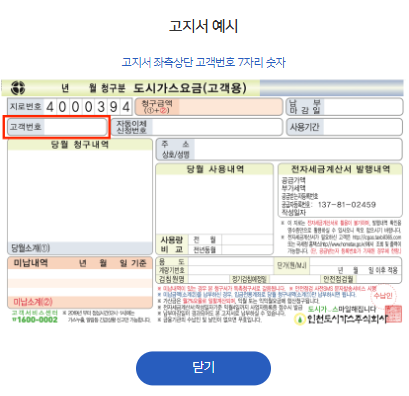 - 필요 정보 입력: 도시가스 공급업체를 선택하고, 고객식별번호와 계약자 이름을 입력합니다.